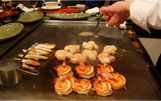 日式鐵板燒是日本料理中最高級別的就餐形式,它不同于中餐的燒烤和韓國燒烤,吃日式鐵板燒是財富和地位的象征。鐵板燒是將食材直接放在熱鐵板上炙烤成熟,這些食材事先不能腌制加工,而是通過高熱的鐵板快速烹調(diào)成熟以保留其本身的營養(yǎng)和味道。由于食材事先不能腌制加工,所以它對原材料的要求是相當(dāng)高的,比如西冷牛肉、菲力牛肉、牛仔骨、銀鱈魚、帶子、鵝肝等等。