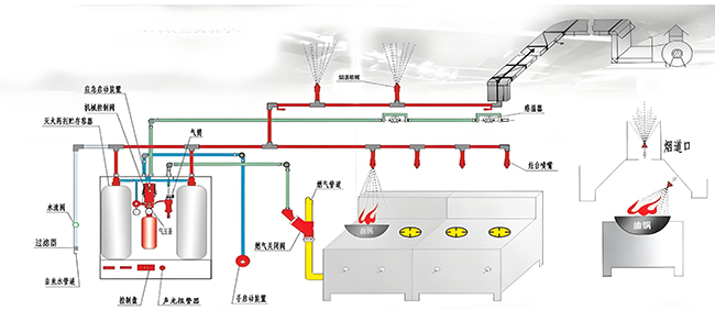 3、廚房專用滅火裝置:廚房專用滅火裝置是由滅火劑儲(chǔ)瓶與關(guān)斷燃料閥機(jī)構(gòu)、機(jī)械驅(qū)動(dòng)裝置、霧化與噴頭管網(wǎng)、感溫易熔金屬探測(cè)器與控制管路、手動(dòng)應(yīng)急啟動(dòng)等組成。廚房安裝該系統(tǒng)之后,可24小時(shí)不間斷的對(duì)廚房的灶臺(tái)、集油煙罩、排煙管道進(jìn)行全方位的消防保護(hù)。