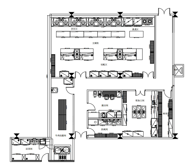 1.與一般通用廚房不同的考慮,例如,一些酒店、大食堂把明檔、開(kāi)放式廚房、風(fēng)味小吃設(shè)在餐廳,增加了服務(wù)項(xiàng)目,也增加了廚房面積。